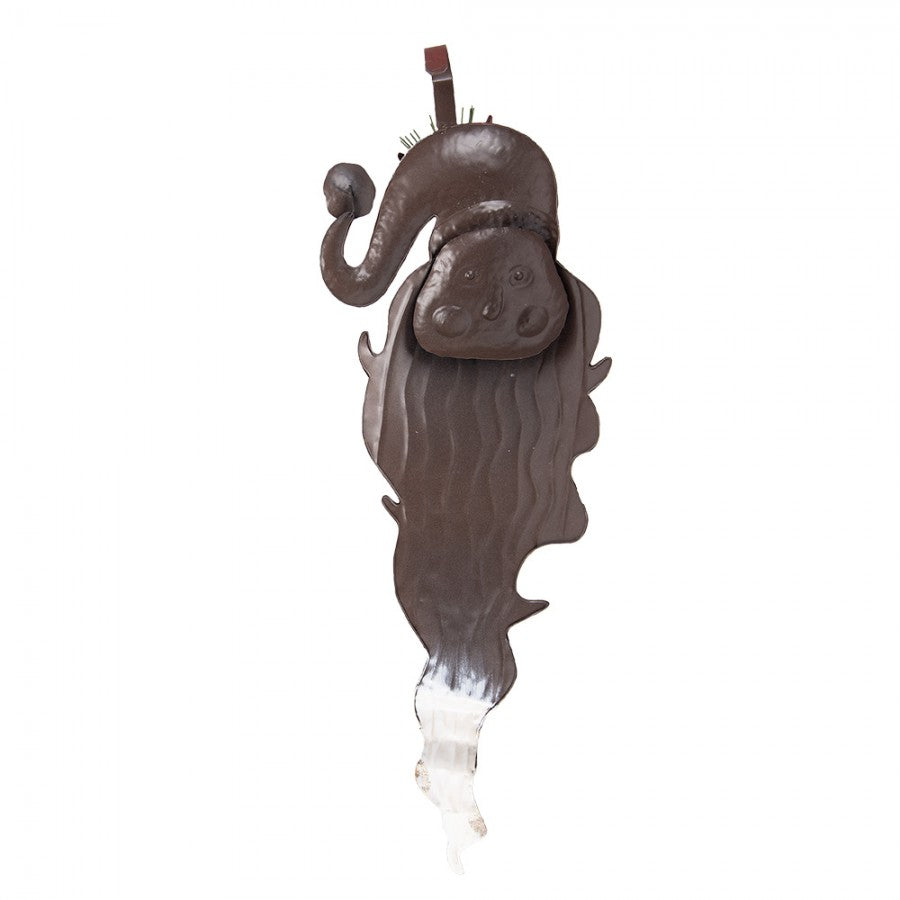 Metal wall decoration featuring Santa Claus with long beard and red hat, finished with holly details. Includes hanging hook. Ideal for front doors, fireplace mantels or above wreaths. Tall and vertical, perfect even in narrow spaces.
