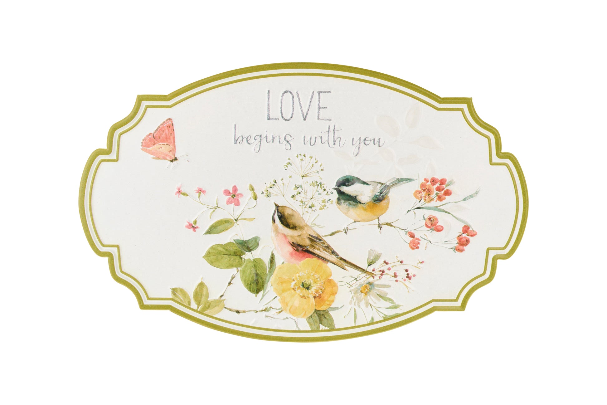 Al centro spicca la dolce dedica "LOVE begins with you", un messaggio d'amore che rende questa decorazione ideale per l'ingresso, la camera da letto o come regalo speciale per una persona cara. Realizzata in metallo di alta qualità con una finitura leggermente anticata, si integra perfettamente in ambienti arredati con gusto provenzale o country chic.