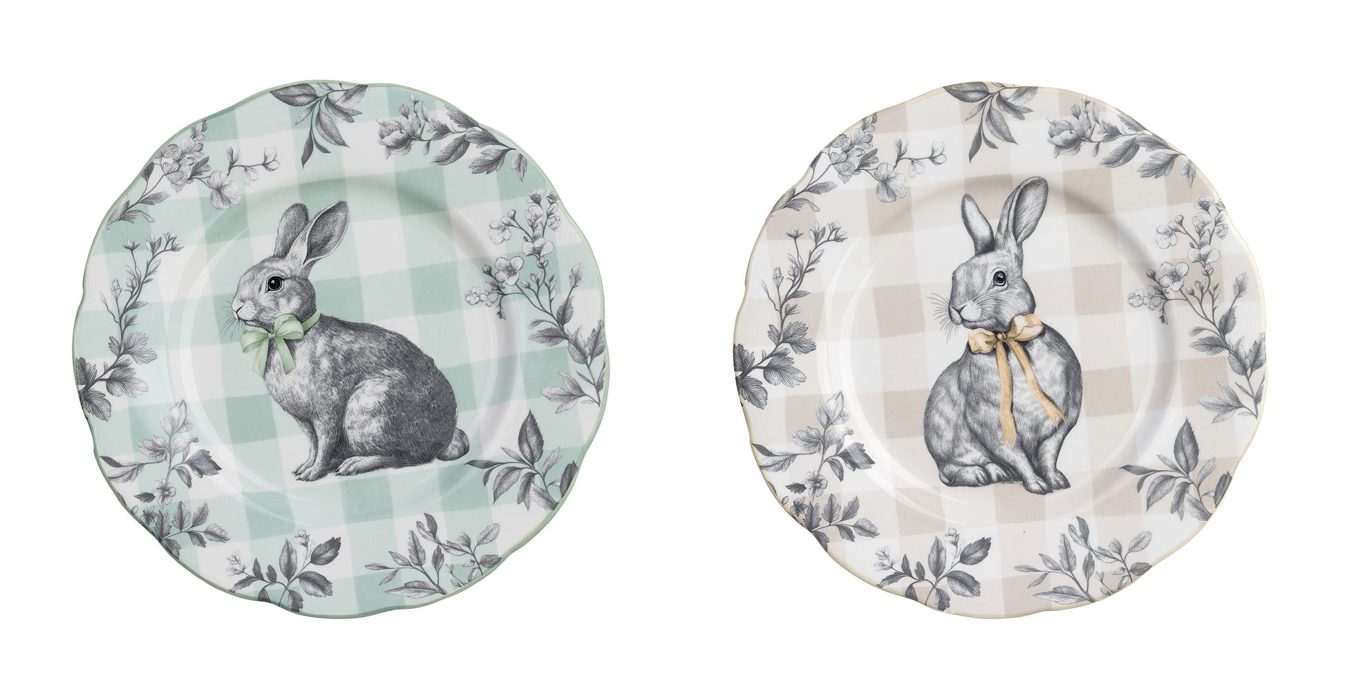 Questi piatti celebrano la fusione tra tradizione e creatività. La superficie presenta una delicata fantasia a quadretti Vichy che fa da cornice a un'illustrazione vintage e dettagliata di un coniglietto con un fiocco, circondato da tralci fioriti e foglioline. Il dettaglio unico è il bordo a onde, che non solo è decorativo ma conferisce un tocco artigianale e floreale a ogni pezzo. Come visibile nell'immagine di ambientazione, i piatti sono disponibili in due palette colore pastello, con disegni del coniglietto leggermente diversi ma complementari.