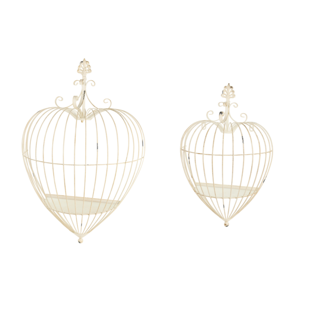 Crea un angolo romantico e poetico nella tua casa con il Set di 2 Gabbie a Cuore della linea Fiorirà di Nuvole di Stoffa. Realizzate in metallo con finitura anticata color crema, queste gabbie decorative sono pensate per essere appese a parete e possono ospitare piante, candele o piccoli oggetti decorativi, trasformandosi in eleganti mensole di design.